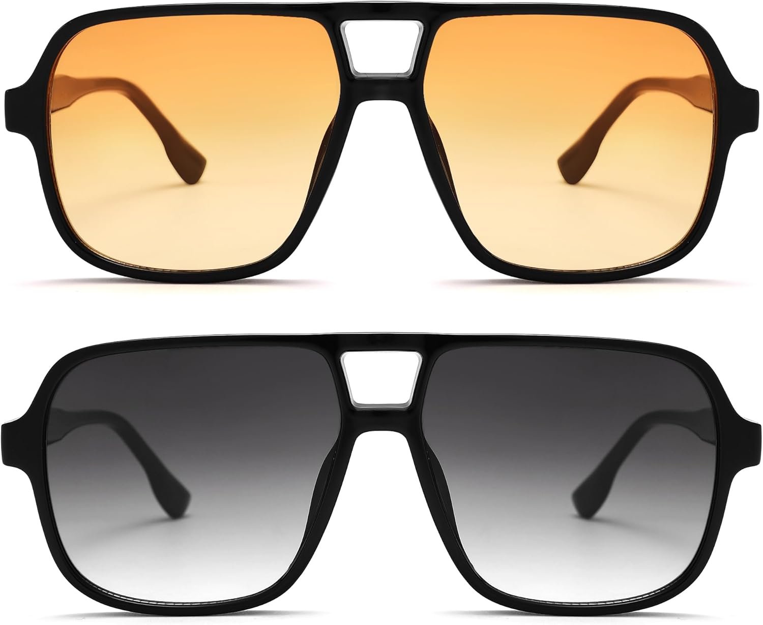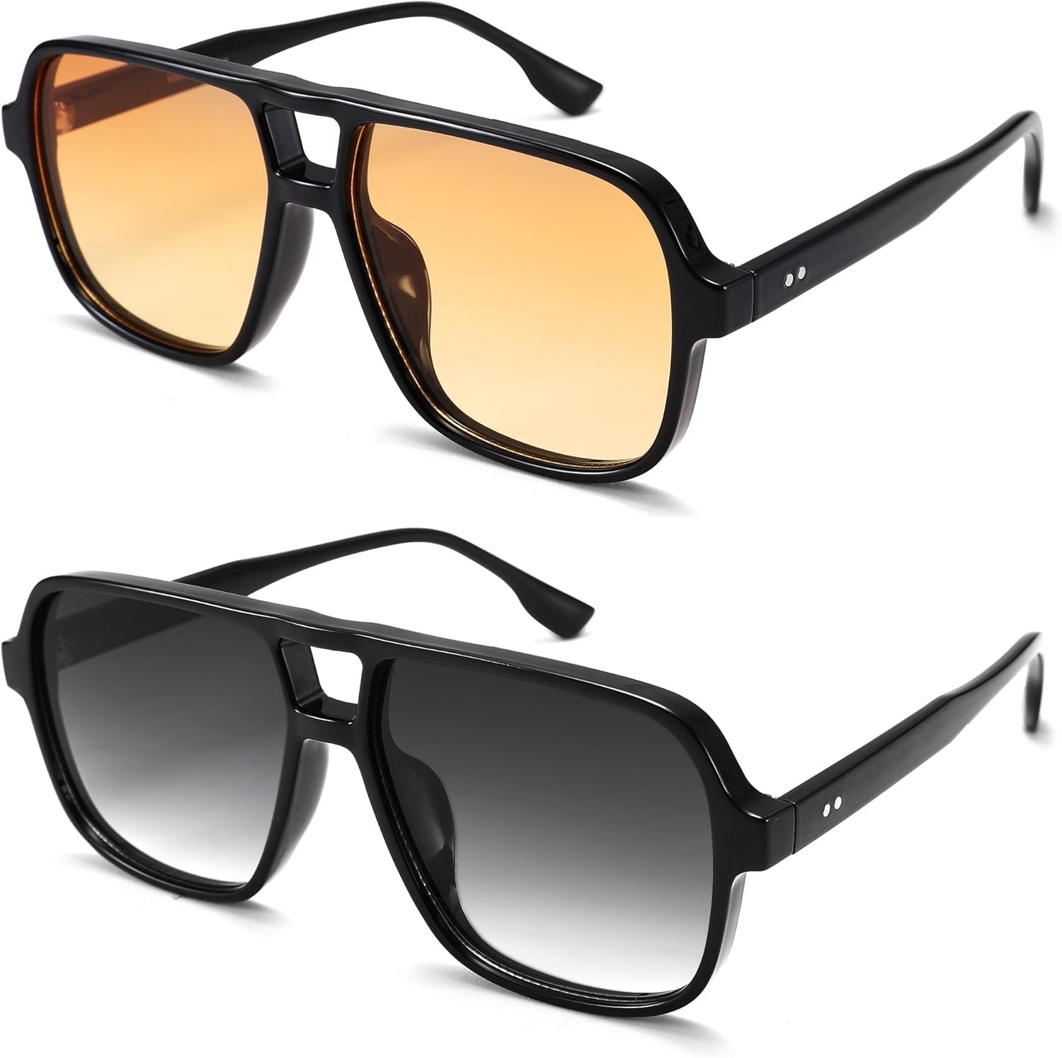 The 2-Pack Aviator Sunglasses features a stylish black frame and comes with two lens options: amber and gray. These sunglasses blend classic design with modern functionality, providing optimal UV protection and comfort. Perfect for any occasion, they are a versatile accessory for those who appreciate both style and practicality.