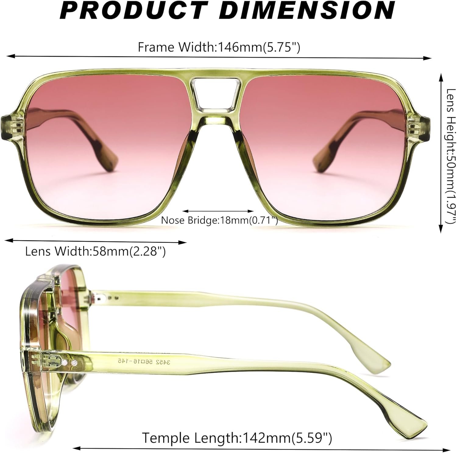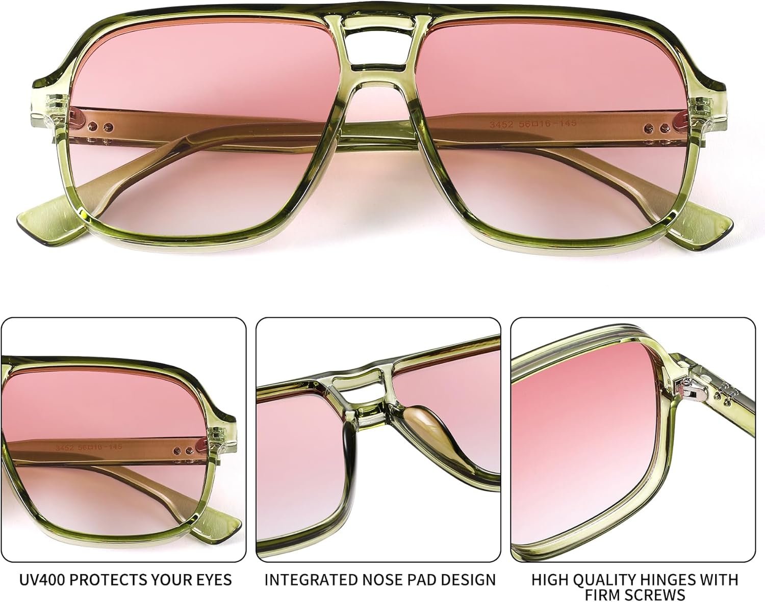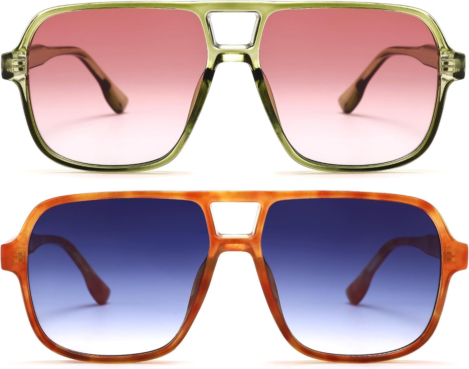 Introducing the 2-Pack Aviator Sunglasses featuring a stylish combination of Green Pink and Amber Blue lenses, designed for both fashion and functionality. These sunglasses are crafted with a classic aviator silhouette that effortlessly blends timeless elegance with contemporary flair. The Green Pink pair offers a vibrant and playful aesthetic, perfect for making a bold statement during sunny outings. In contrast, the Amber Blue option provides a more subdued yet equally chic look, ideal for a range of occasions. Both pairs are equipped with high-quality lenses that offer UV protection, ensuring your eyes remain shielded from harmful rays while you enjoy outdoor activities. The lightweight frame ensures comfort during extended wear, making them suitable for daily use. Whether you are heading to the beach, attending a music festival, or simply looking to elevate your everyday style, this 2-Pack Aviator Sunglasses set is a versatile addition to your accessory collection. Embrace your individuality and enhance your look with these must-have sunglasses.