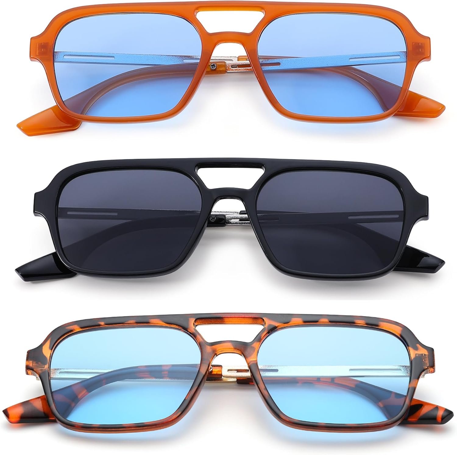 This 3-pack of rectangle sunglasses offers three coordinated frame options in blue and smoke finishes, providing versatile styling for varied outfits and occasions. Each pair features a modern rectangular silhouette that flatters a wide range of face shapes, making the set practical for everyday use, travel, or gifting. The assorted collection simplifies wardrobe coordination by delivering multiple looks in a single purchase, combining functionality with contemporary design.