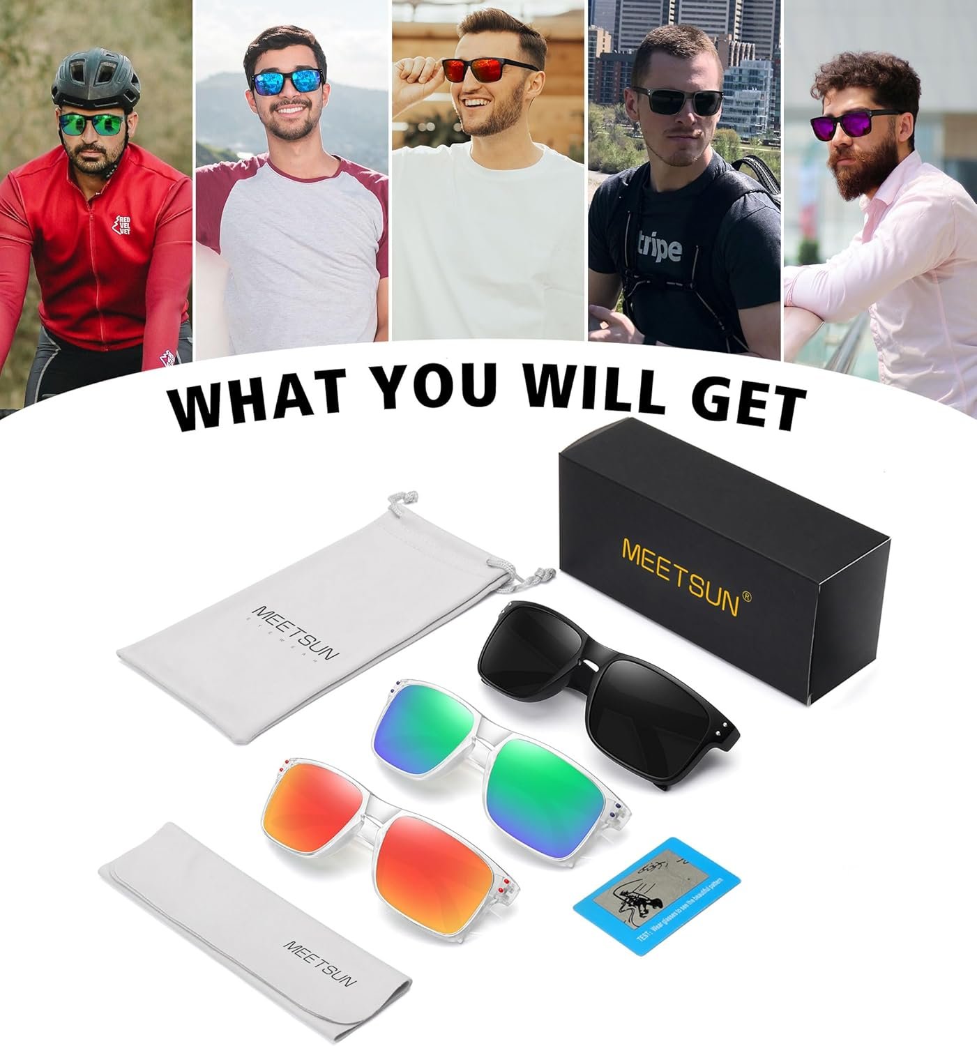 Three-piece set of rectangle sunglasses in black and clear frames with mirrored lenses, delivering a sleek, modern aesthetic ideal for everyday use and travel.