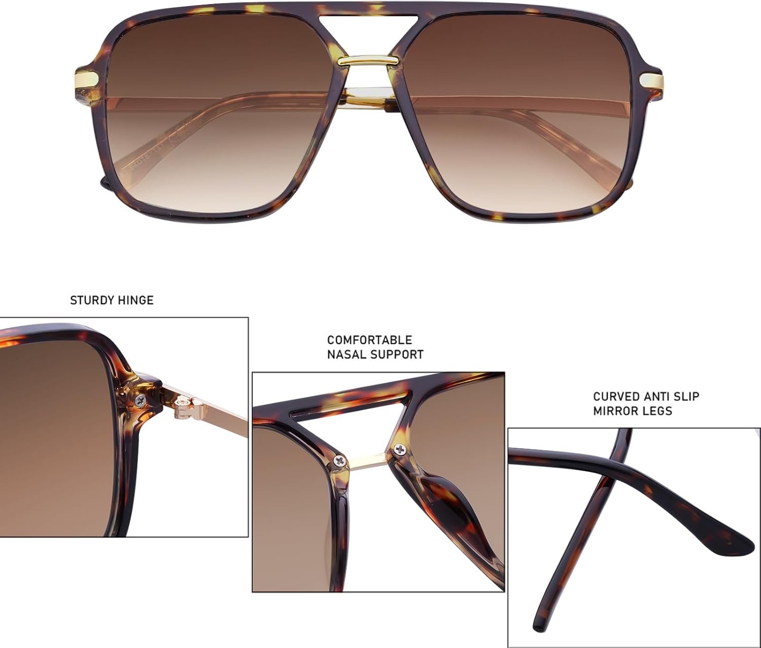 Introducing the Tortoise Oversized Square Sunglasses in a stunning brown gradient, designed for those who appreciate both style and functionality. These sunglasses feature a bold oversized square frame that complements a variety of face shapes while making a fashionable statement. The rich tortoise shell pattern adds a touch of sophistication, seamlessly blending classic and contemporary aesthetics. The brown gradient lenses not only provide excellent UV protection but also enhance visual clarity, making them perfect for sunny days. Crafted from high-quality materials, these sunglasses are lightweight and comfortable, ensuring they can be worn all day without discomfort. Whether you’re lounging at the beach, enjoying a city stroll, or attending a summer event, these sunglasses are an essential accessory that elevates any outfit. Experience the perfect combination of elegance and practicality with the Tortoise Oversized Square Sunglasses, a must-have addition to your eyewear collection.